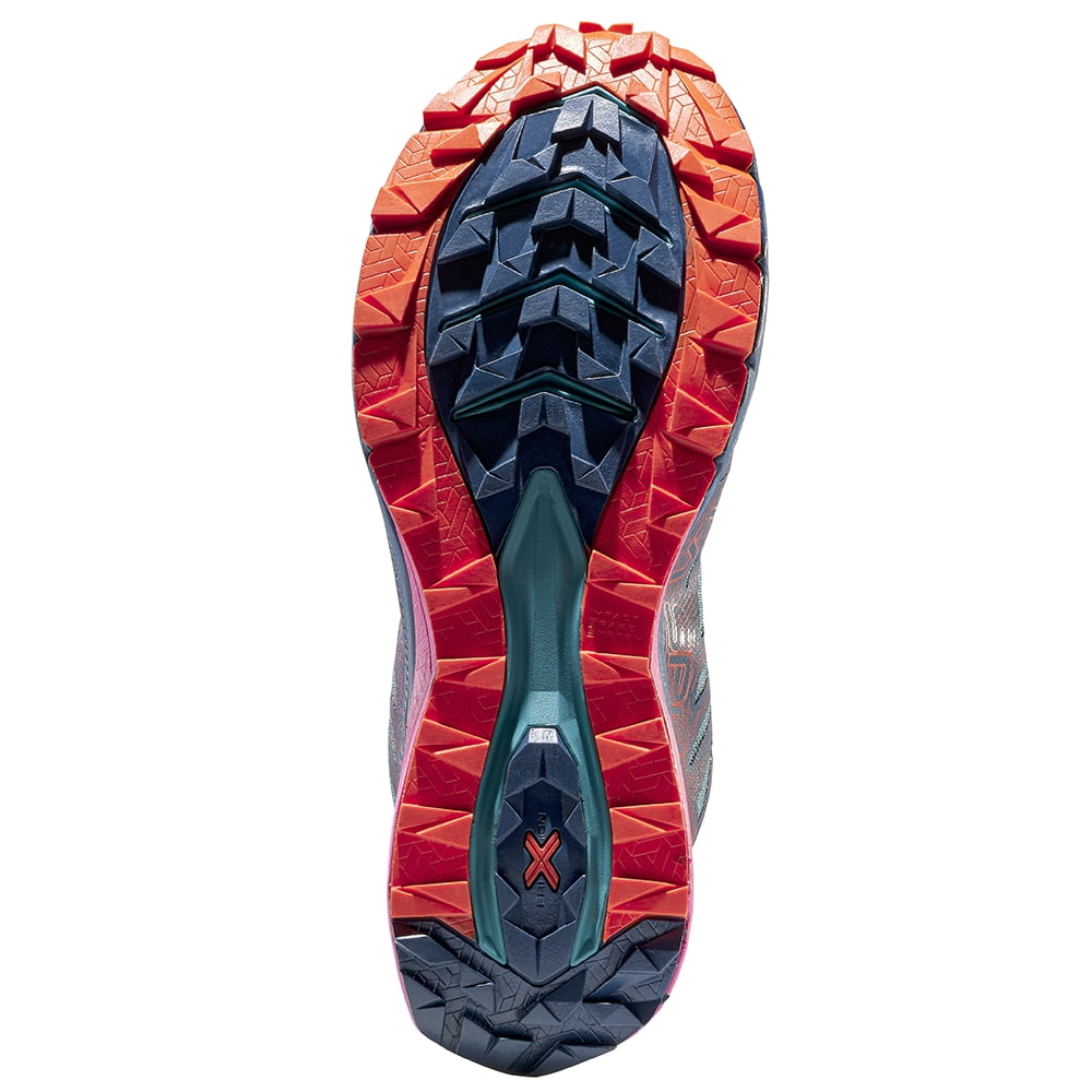 Podrážka z dvojitej zmesi FriXion Red s bočnými výstupkami Impact Brake System pridáva istotu pri výbehoch aj pri zbehoch a vzor 3.5 mm je univerzálna voľba do rôznych typov terénu. Jackal II Women’s je presne tá trailová topánka La Sportiva, ktorá ťa bude baviť na dlhých trasách, na ultra pretekoch aj pri pravidelnom nabiehaní kilometrov, pretože spája odpruženie, odolnosť a komfort do jedného vyváženého celku.