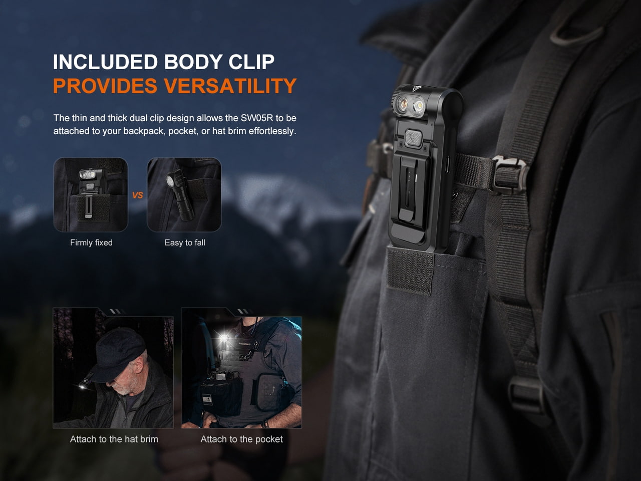 Fenix SW05R-UV je multifunkčné svietidlo s otočnou hlavou, kompaktnými rozmermi a hmotnosťou iba 55 gramov. Ponúka svetelný tok až 150 lúmenov (ANSI). Svetelný kužeľ rovnomerne osvetľuje široký priestor do vzdialenosti až 39 metrov. Na napájanie slúži integrovaný akumulátor s kapacitou 700 mAh, ktorý sa nabíja cez moderný USB-C konektor na boku svietidla. K dispozícii sú celkom tri režimy bieleho svetla a UV svetlo s vlnovou dĺžkou 365 nm o sile 1500 mW. Svietidlo je dodávané vrátane pevného klipu, takže ju môžete uchytiť na vrecko, popruh batohu či šilt čiapky a uvoľniť si tak pri svietení ruky. Vďaka magnetu v pätke svietidla ju môžete prichytiť k čomukoľvek železnému. Hlava s diódami je otočná v rozsahu 200 stupňov. To robí svietidlo v kombinácii s možnosťami uchytenia veľmi praktické. SW05R využijú najmä policajti a ďalší profesionáli v službe a pri práci, ale skvelá je aj pre EDC. Vďaka malým rozmerom, plochému tvaru a váhe ju môžete mať stále pri sebe.