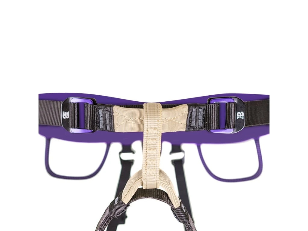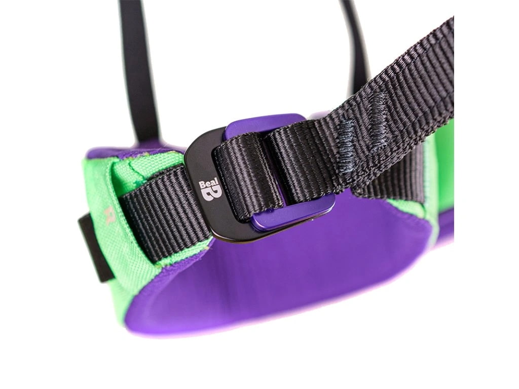 Veľkou prednosťou sú štyri nastaviteľné kovové spony s intuitívnym automaticky uzamykateľným systémom, ktoré umožňujú rýchle a presné nastavenie počas niekoľkých sekúnd. Ergonomicky tvarované polstrovanie v kombinácii so systémom popruhov pomáha rovnomerne rozložiť záťaž a zvyšuje pohodlie pri lezení aj pri dlhšom nosení. Farebne zvýraznené naväzovacie oko uľahčuje inštruktáž aj kontrolu správneho naviazania, čo ocenia rodičia, inštruktori aj deti samotné.