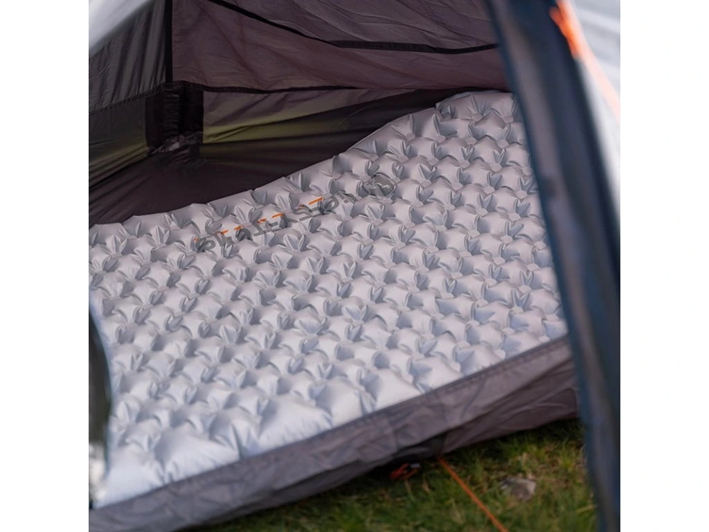 O pohodlie sa stará 360 vzduchových buniek, ktoré rovnomerne rozkladajú tlak po celej ploche, takže karimatka príjemne podopiera telo a pomáha obmedziť preležaniny aj na tvrdom podklade. Materiál 40D ripstop nylon s PU záterom, podlepenými švami a vodným stĺpcom 13000 mm pridáva istotu v mokrom prostredí a pri nocovaní pod prístreškom, v stane aj na vlhkej zemi. Nafúknutie a vyfúknutie je rýchle a jednoduché, navyše s pumpovacím vakom to zvládneš bez zbytočnej námahy a bez fúkania do ventilu.