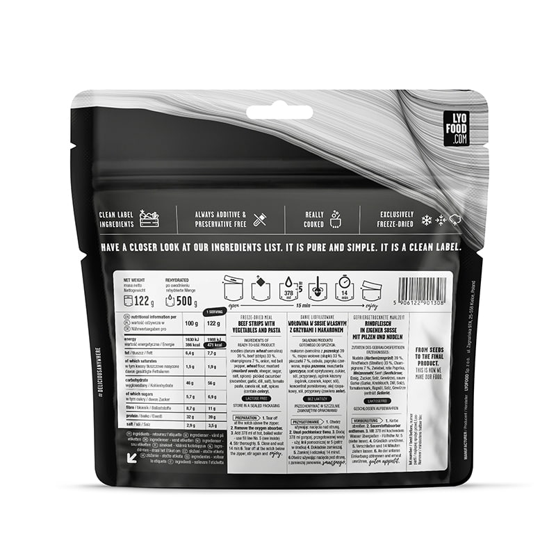 Rezance (krupica tvrdej pšenice) 39%, hovädzie mäso (prúžky) 33%, šampiňóny 7%, cibuľa, červená paprika, pšeničná múka, horčica (horčica, ocot, soľ, cukor, kurkuma), nakladaná uhorka (uhorka, cesnak, kôpor, soľ), soľ, paradajková pasta, kanolový olej, korenie (obsahuje zeler)