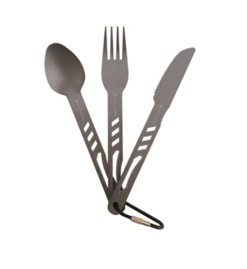 Ferrino Set Cutlery Alu je ultralahká sada príboru na turistiku, kemping, cestovanie aj každodenné outdoor použitie, kde oceníš nízku hmotnosť, kompaktné rozmery a jednoduché prenášanie. Sada obsahuje lyžicu, nôž a vidličku, takže ponúka praktické riešenie na jedlo na výletoch, v kempe aj pri dlhšom pobyte v prírode. Vďaka karabínke na pripnutie máš príbor vždy pokope a jednoducho pripravený na použitie.