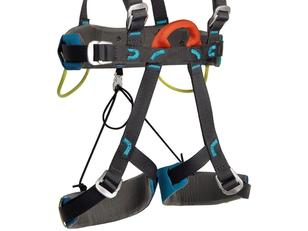 Veľkou prednosťou je tepelne tvarované polstrovanie v oblasti pása a nôh, ktoré je možné posúvať po nosných popruhoch a prispôsobiť tak úväzok rôznym detským postavám. Vďaka piatim nastaviteľným bodom je možné úväzok presne doladiť od veľmi malých detí až po deti s hmotnosťou do 40 kg. Zosilnený predný naväzovací bod je farebne odlíšený pre jednoduchšiu orientáciu a slúži na naviazanie lana alebo pripojenie odsedky. Praktickým detailom sú aj samozamykacie pracky z nehrdzavejúcej ocele, dve materiálové oká a odopínateľné nohavičky, ktoré uľahčujú používanie aj obliekanie.