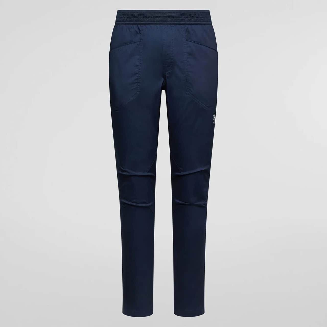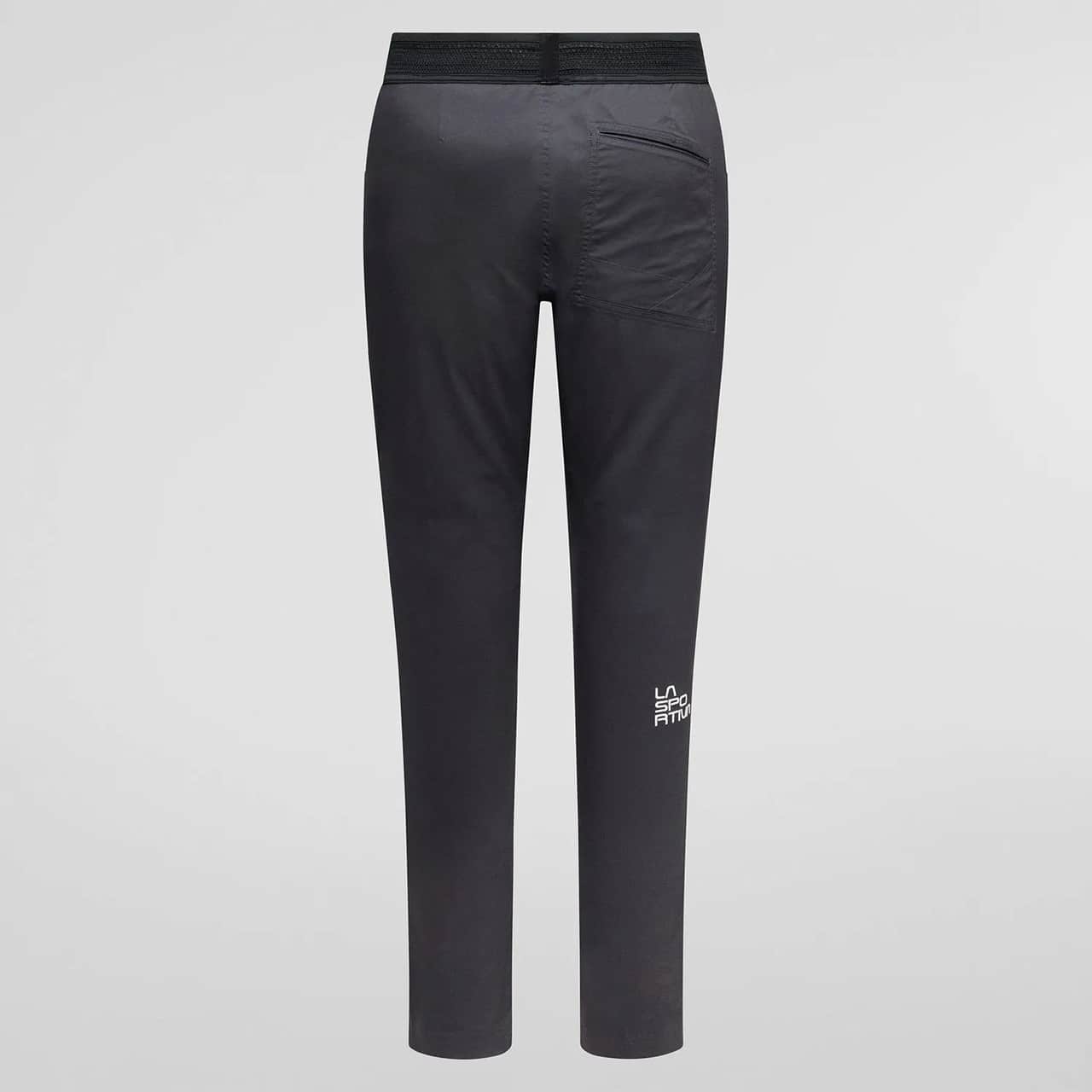 Elastický pás a konštrukcia s klinom spolu s anatomicky tvarovanými kolenami držia pohodlie aj pri celodennom lezení a zároveň sú kompatibilné so sedákom, takže nikde netlačia a neprekážajú pri istení ani pri lezení na obtiažnosť. Slim strih pôsobí čisto a funkčne, no vďaka pružnému materiálu neobmedzuje, keď potrebuješ rotáciu v bokoch alebo široký krok do boulderingového kroku. Praktickým detailom sú dve veľké otvorené predné vrecká so spevnenými lemami, aby si mal drobnosti poruke, a veľké zadné vrecko na veci, ktoré chceš mať rýchlo dostupné mimo steny.