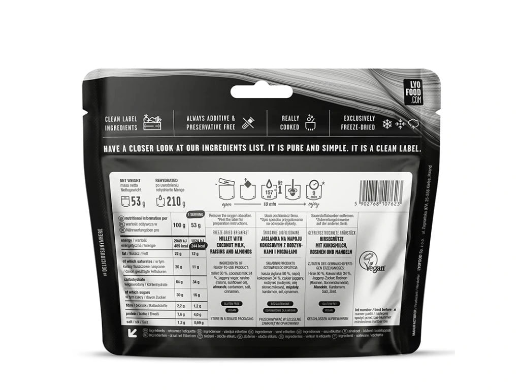 LyoFood Ovsený Payasam je sýte lyofilizované raňajky inšpirované autentickým indickým receptom, ktoré prinášajú sladké, jemne korenené chute a poctivé BIO suroviny do každého rána na cestách aj doma. Táto mrazom sušená strava poteší všetkých, ktorí hľadajú rýchle, ľahké a pritom naozaj chutné vegánske raňajky bez lepku, umelých prísad a zbytočných kompromisov.